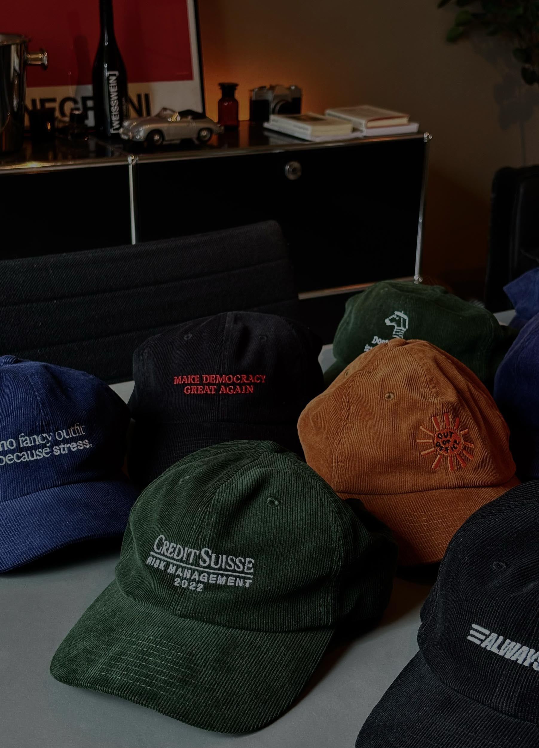 Der charakteristische Corduroy Stoff hebt sich von Standard Caps ab.